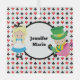 Cute Alice in Wonderland theme custom Christmas glass ornament gift for a book lover or librarian who loves to read children's books. Little girl Alice in her blue dress and the Mad Hatter sit on top of a deck of cards pattern in red and black featuring spades and diamond symbols. Customize with your own text.