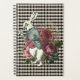 Whimsical planner pattern features tinted version of the original Alice in Wonderland's White Rabbit with added floral bouquet on black and white harlequin diamond background.