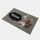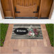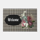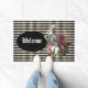 Whimsical home decor features tinted version of the original Alice in Wonderland's White Rabbit with added floral bouquet on black and white harlequin diamond background. "Welcome" text in black oval can be customized or left as-is.