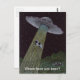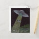 A colour pencil drawing of an unfortunate cow being abducted by aliens in a flying saucer adorns this fun postcard! Customize by changing the text to suit yourself!