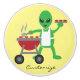 Green Martian type alien grilling food on the barbecue to customize, personalize by changing to your name