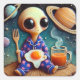 A funny Alien dressed in PJs with a coffee and egg for breakfast adorable AI generated art