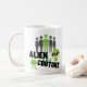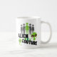 This image features a playful and whimsical design centred around the theme of aliens and fashion. A group of six cartoon aliens, depicted in a line, stand in front of the bold text "ALIEN COUTURE". The aliens are all green, with large eyes and simple, rounded bodies. The central alien is standing tall and is the largest of the group, while the others are shorter and more slender. The text "ALIEN COUTURE" is large and bold, written in black block letters, and appears to be draped over the aliens, suggesting a connection between the extraterrestrial beings and the world of fashion. The design is vibrant and colourful, with a playful, almost childlike quality.