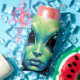 Extraterrestrial can cooler. A captivating otherworldly design with an extraterrestrial alien being with big bulging eyes holding the reflections of other planets, including earth in them.
