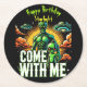 Two vividly coloured alien figures stand together, depicted in a dynamic pose. One is tall and muscular, while the other is smaller, exuding a friendly vibe.