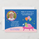 Cute and colourful invitation ideal for a party with a space or alien theme. Features a happy Alien peaking out of a space ship window, holding party balloons and a peace white flag. Great invitation for a girl that enjoys space ships, aliens and stars. Add your child’s photo for a personal touch.