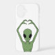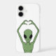 Vivid green alien forming a heart with arched arms against black, blending sci-fi whimsy with playful charm. Bold contrast, perfect for space fans and quirky casual outfits.
