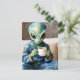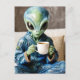 A funny Alien dressed in blue pjs with an extra large morning coffee