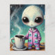 A funny Alien dressed in pjs with an extra dark morning coffee