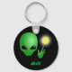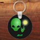 A fun keychain for any science fiction lover. It features a head and glowing hand of a green alien. There is a space at the bottom for a name or message.