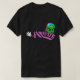 Imagine a shirt with the word "ALIENS" in bold, retro-style font stretched across the chest. Above the text, there's a playful, cartoon alien head with large, friendly eyes, wearing a slightly tilted baseball cap. The alien has one arm raised, casually waving hello, giving it a fun, friendly vibe.