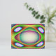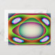 This postcard features a multicoloured pattern of bright psychedelic colours surrounding a central egg shaped structure. It resembles a fantasy of an alien spaceship ready to abduct an earthling.