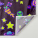 A cute space scene filled with yellow stars, colorful planets and adorable characters. A green alien with rocket shoes, an alien flower in a flowerpot, a retro futuristic rocket car with a lady and her pet cat riding in it, and a flying saucer with a happy alien poking its eyes out. With MLO, the artists signature, tucked under the planets.