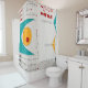 Rideau de douche moderne du milieu du siècle inspiré de la période du milieu du siècle. Conception abstraite de triangles, rectangles, cercles et lignes sur un arrière - plan brun clair avec un motif de lignes.