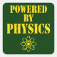 Powered By Physics - pochoir jaune lettrage et graphique atomique sur un arrière - plan vert foncé.