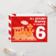 Birthday party invitation orange train on red warning stripes. Perfect to invite your son's favourite friends to his birthday bash. Customize with your own details. Uniquely designed and illustrated by Sarah Trett.