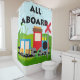 Kids who love trains will love this colourful, fun train theme shower curtain featuring a locomotive and car on a railroad track with black text that reads All Aboard!
