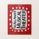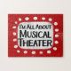 "I'm All About Musical Theatre" is a cute text design in red with black text, along with a white accent shape and white textured whimsical dots surrounding it.