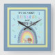 This adorable clock has a modern rainbow with two whimsical puppy dogs standing under it. The top row of the rainbow has little puppy dog prints climbing up both sides leading to a heart on top. Typography reads It's all about Rainbows and Puppy Dogs. The letters in "Rainbows" are all done in different colours and there are different coloured dog bones scattered about. Background is a pale sky blue with a darker blue and yellow border.