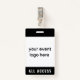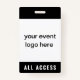 Customize this simple, modern all access event pass badge with your logo. If your logo is square, it will fill up the white space entirely. If your logo is not square, it will show on a black background. The back of the badge can be personalized with the event name and date or year, or you can delete both to have an all black back. This minimalist all access pass badge is ideal for various types of passes at special events, festivals, concerts and conventions. You can easily personalize the name of the pass if you like also.