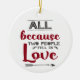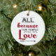 This white modern Christmas ornament features a romantic caption written in red and gray fonts, that reads "All because two people fell in love", decorated with a gray arrow and little hearts.