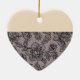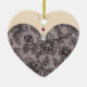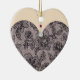 Heart-shaped ceramic ornament with an image of black lace over pink, suggesting a black lace gown, and a diamond and ruby necklace on flesh. The back is flesh with an image of black lace over pink suggesting the back view of the gown. See matching "All "All Dressed Up 2" heart-shaped ceramic ornament. See the entire Cancan Ornament collection in the PARTY FAVORS section.