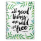 All good things are wild and free. Design features the quote in crisp black brushstroke text surrounded by jungle green botanical leaves in watercolor.