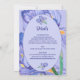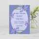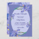 Pretty purple wedding card with lilac frame surrounded by purple and orange irises,the invitation is write in calligraphic font The back has an iris for the background and also the same oval frame embellished with small irises