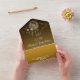 invitación con elegante textura miel degradado y foto de pareja y palomas con anillos y brillo con el texto dorado para una simple boda.