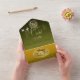 invitación con elegante textura verde degradado y foto de pareja y palomas con anillos y brillo con el texto dorado para una simple boda.