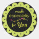 Kiwi green with contrasting black makes this "made for you" label pop! This sharp design is perfect for adding to your baked goods, crafts, cards, or any handmade gift. These stickers are appropriate for all occasions and holidays and have a rich, high gloss finish. Very professional appearance. Labels adhere nicely to all surfaces including ribbon, paper, cardboard, plastic, or glass.