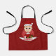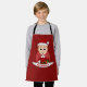 Kids' apron with an illustration of a cute smiling happy boy with ginger hair, the boy is wearing a Santa Clause costume with a red hat and holding a present, in a red circle; with a customizable text template for your child's name or message
