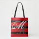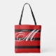 A stylish tote bag with your name and initials on a pattern background of large red stripes