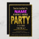 All purpose generic party invitation. This invitation features gold lettering with a bold "PARTY" in glitter with a glitter border. Note: This is a graphic art print design by Amelia Carrie and contains no messy glitter.