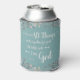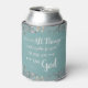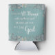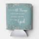 Drink holder with distressed white typography on textured aqua background surrounded by watercolor flowers, with well known verse from Romans 8:28, “… All things work together for good for those who love God…”