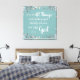 Canvas print with distressed white typography on textured aqua background surrounded by watercolor flowers, with well known verse from Romans 8:28, “… All things work together for good for those who love God…”