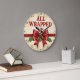 This festive clock features the bold, red text "ALL WRAPPED UP" on a vintage, aged parchment background studded with gold nail heads or rivets. The lower half of the clock is dominated by a large, sumptuous red velvet ribbon tied in a bow, accented with holly and red berries. A red ribbon border runs horizontally across the center. The design may look real due to the high detail and three-dimensional texture in the artwork.