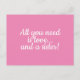 All you need is love and a sister. Pink and White postcard with handwritten white script typography.