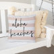 Blush pink striped outdoor pillow practically screams summer with "aloha beaches" overlaid in off-black handwritten lettering. A perfect addition to your pool area, backyard or beach house.