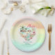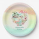 Tropical summer Hawaiian-themed party paper plates in pastel colours, featuring a tropical heart with a beach view, flamingos, and flowers with a rainbow-coloured background. Easily personalize the text. - Kate Eden Art