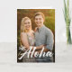 Modern, tropical holiday greeting card displaying your full-bleed vertical photo on the front with "Aloha" in a white hand-lettered script complimented by a hand-drawn palm tree. Personalize the front of the Aloha holiday card by adding your name. The inside of the Aloha holiday card features white ocean waves against a light grey blue background on the left with your custom message on the right. The back of the card features space for an additional photo. Designed to coordinate with our Aloha Palm Tree holiday collection.
