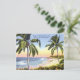 Vintage post card reproduction "Along the Florida Keys on the way to Key West, Florida" shows a pastel-tinted beach scene with palm trees, circa 1940s.