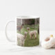 This is a wonderful mug! It has alpacas frolicking in a pasture and provides a bit of lovely whimsy to the mornings I use it for my coffee. The mug itself is just great! It's made of solid white china and holds 15 ounces of coffee, just the right amount for me in the morning!!! In addition, it has a nice wide handle so it's easy to hold. A+++++++++ for this lovely and practical alpaca mug! This mug did not have any printing on it, so I can't comment on that. I gave it 3 stars since this was required for the review.