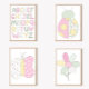 A combination of soft, quilt inspired designs (with flowers, hearts, and plaid), on letters of the alphabet create this cute, bedroom, wall decor art print. The background is white, while the letters consist of various patterns in shades of green, yellow, white, and pink. This art print features a signature by me, the artist.