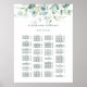This wedding seating chart features painted watercolor eucalyptus, botanical green, and light blue leaves.
