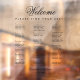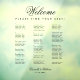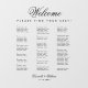 All text is black. The word Welcome is written in an elegant calligraphic script, the rest in caps. The names are ordered alphabetically on 3 columns. Above them and under the word Welcome, there is the message "Please find your seat!".