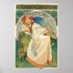 Alphonse Mucha Princess Hyacinth poster. Lithograph poster from 1911. Czech artist Alphonse Mucha created some of the most gorgeous advertisements and posters of the art nouveau period. Princess Hyacinth is a work featuring a beautiful girl wearing a crystal crown with red flowers in her hair. The woman holds a crystal snowflake and sits in a cream coloured gown. Behind her the poster is ornamented with an intricate pattern of stars, crowns, and other shapes. Above reads the text “Princesna Hyacinta.” A beautiful gift for fans of Alphonse Mucha, art nouveau, and vintage posters and advertisements.