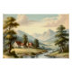 Lithochromography showing a bucolic landscape in a classical pictorial style. You can see three traditional houses with red roofs located on a gentle hill. In the foreground, a river winds through the landscape. In the background, majestic mountains rise under a bright sky with delicate clouds. Hardwood trees surround the stage, creating a peaceful and idyllic atmosphere.
