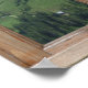 Poster that looks like a window -- an Alps scene This is a typical Alpine scene from a mountain, looking over at another building perched high in the Alps mountains and at the peaks of a distant mountain range beyond. Below are mountain meadows and trees on the green slopes. This picture that looks like a window captures the spirit of an Alpine summer's day in the mountains of Europe.