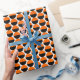 A retro pattern design made up of alternating crescents in orange and black.